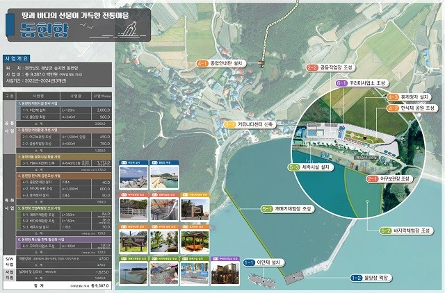 군은 송지 동현항에 총사업비 94억 원을 투입, 어항시설을 정비하고, 다목적 커뮤니티센터, 어항공원 등을 조성하며, 문내 임하항에는 76억 원을 투입해 방파제 신설, 임하바다갤러리 조성, 복지센터 신축 등을 추진한다.