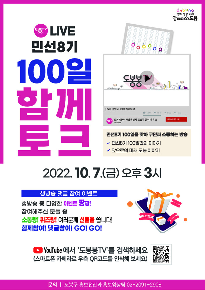 이번 토크쇼는 구 공식 유튜브 채널 도봉봉TV를 통해 생중계되며, 누구나 참여할 수 있다. 기타 자세한 사항은 구 홍보전산과 홍보영상팀으로 문의하면 된다.