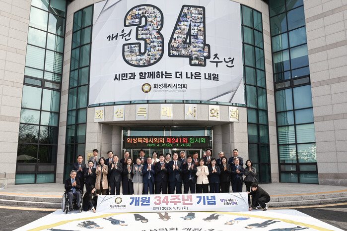[화성=송윤근 기자] 경기 화성특례시의회(의장 배정수)는 15일 오전 10시 30분, 시의회 본회의장에서 개원 34주년 기념식을 개최하고, 지난 의정 활동의 성과를 돌아보며 미래를 향한 새로운 도약의 의지를 다졌다.