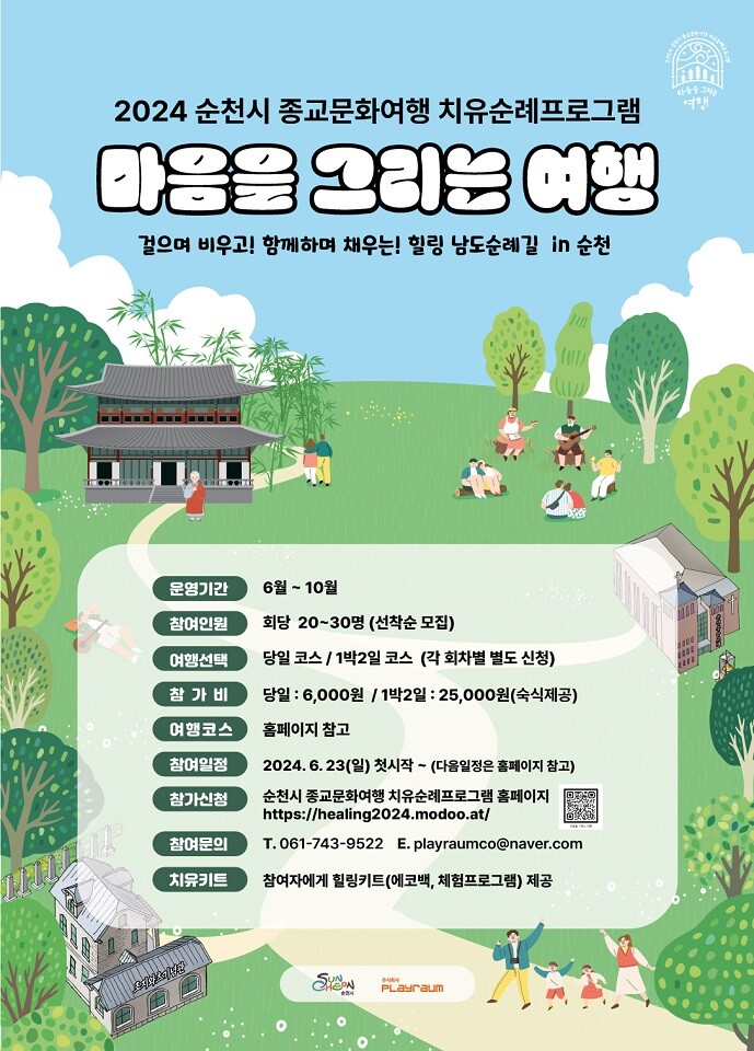 순천 종교문화여행 치유순례프로그램은 문화체육관광부가 후원하고 시 주최로 운영되고 있으며, 우리나라를 대표하는 삼보사찰인 송광사를 중심으로 지역내 종교유산(기독교역사박물관ㆍ매산 등 근대 유적 일원 등)을 활용한 마음 힐링 프로그램을 진행하고 있다.