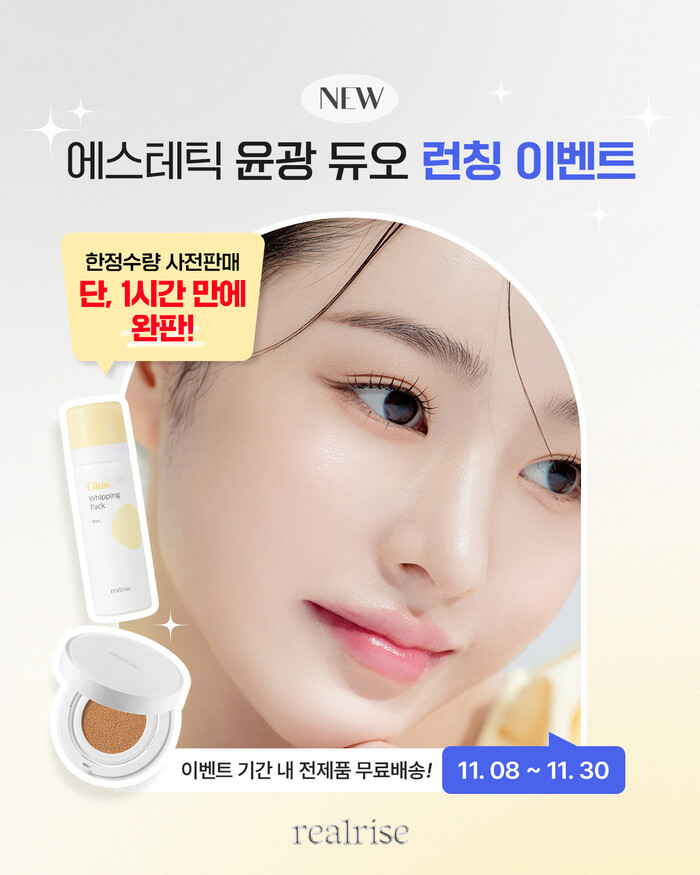 온라인 편집숍 '리얼라이즈'는 에스테틱 전문 코스메틱 제품을 통해 피부를 미세하게 다듬어 주는 '글로우 휘핑 팩'과 '일루미네이팅 스파 쿠션'의 정식 출시했다고 전했으며 자사몰에서 세트 제품을 구매 시 최대 25% 할인 혜택을 제공한다.