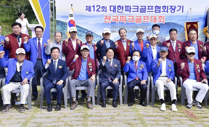 [광주=정찬남 기자] 강기정 광주광역시장(앞줄 가운데)이 21일 오전 광산구 서봉파크골프장에서 열린 '제12회 대한파크골프협회장기 전국파크골프대회 개막식'에 참석해 박병규 광산구청장, 이금용 대한파크골프협회장 등 내빈들과 기념촬영을 하고 있다./광주광역시 제공
