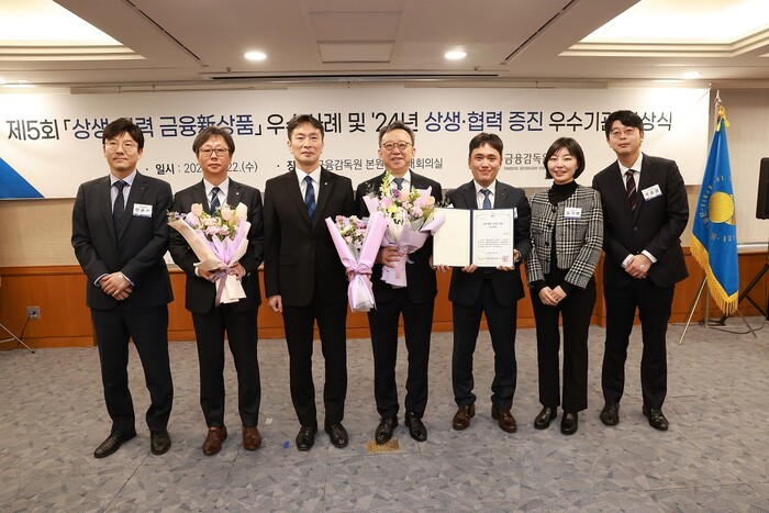 | ▲ 서울시 여의도 금융감독원에서 개최된 ‘제5회 상생·협력 금융신상품 우수사례’ 시상식에서 신한은행 정상혁 은행장(오른쪽 네번째), 금융감독원 이복현 원장(왼쪽 세번째) 및 관계자들이 기념촬영하는 모습. (사진=신한은행 제공) |