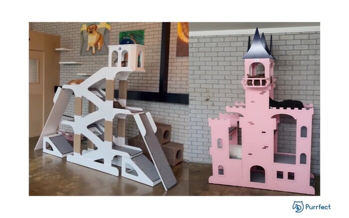 퍼르르펙트의 산토리니 언덕위의집 캣타워는 고양이가 올라가는 통로가 선반형이 아닌 경사로 타입으로, 아기 고양이부터 관절 아픈 노령묘까지 모두 사용하기 좋게 점프를 하지 않아도 되는 캣타워이다. 특히 고양이가 지나다니는 통로에 구멍이 없어 높은 곳을 무서워하는 고양이, 조심성 있는 고양이 모두 사용 가능하다.