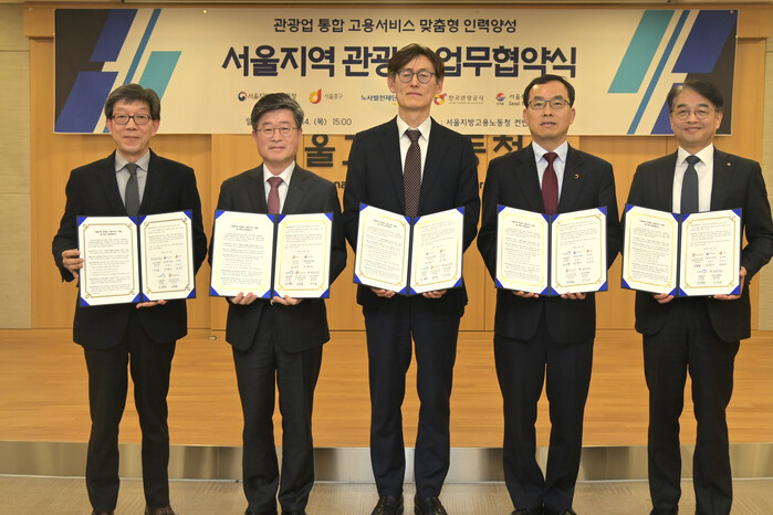 ‘관광 1번지’ 중구(구청장 김길성)가 최근서울지방고용노동청에서 서울지방고용노동청(청장 하형소), 노사발전재단(사무총장 김대환), 한국관광공사(관광산업본부장 김동일), 서울특별시관광협회(회장 권한대행 박정록)등과 '서울지역 관광업 고용서비스 제공을 위한 업무협약' 을 체결했다.