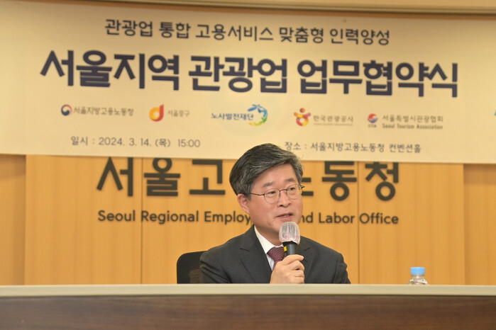 | ▲ 서울지역 관광업 고용서비스 업무협약식에서 김 구청장이 인사말을 하고 있다. |