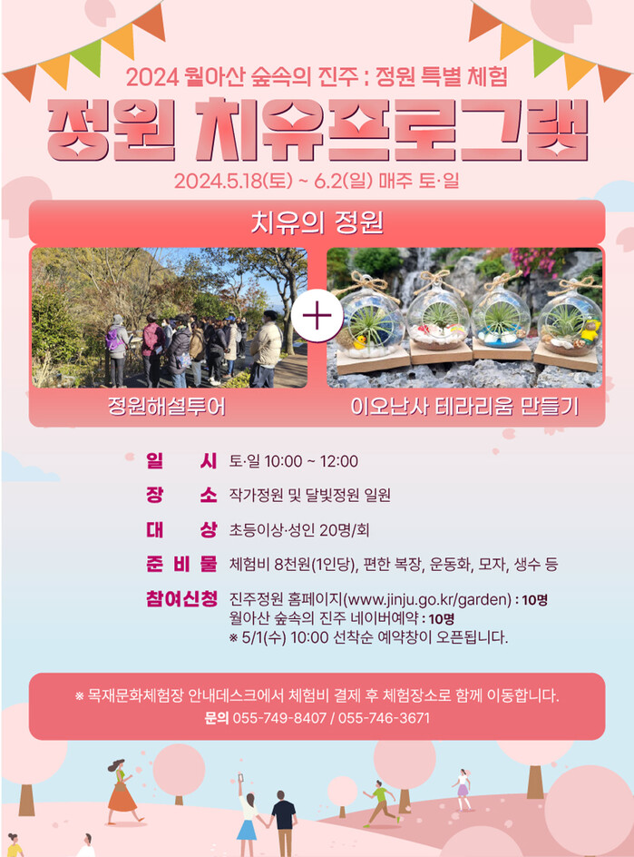 신청은 진주 정원 홈페이지와 월아산 숲속의 진주 네이버 예약에서 진행되며 기타 자세한 사항은 진주시 산림과로 문의하면 된다.