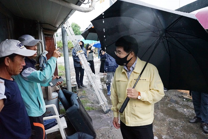 서강석 서울 송파구청장은 지난 8일 폭우가 쏟아진 데에 이어 9일에도 강한 비가 예측되자 피해 현장 점검에 나서 문정동 화훼마을을 방문했다. 해당 지역은 지난 8일 침수피해 우려로 70여가구 주민들을 대피시켰으며 응급구호세트(담요·칫솔 등) 지원물품을 지원했다. 사진은 9일 서 구청장(오른쪽)이 화훼마을 침수 현장에 방문해 점검하고 있는 모습. (사진제공=송파구청)