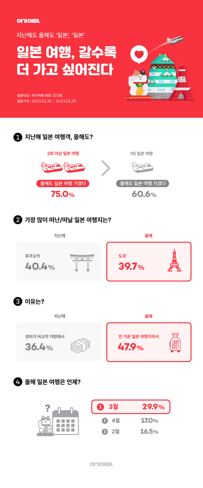 [시민일보 = 이대우 기자] 대한민국 대표 종합 여행·여가 플랫폼 여기어때(대표 정명훈)은 지난해 2회 이상 일본을 다녀온 여행객 중 75.0%가 ‘올해도 일본을 가겠다’고 응답한 설문 결과를 발표했다.