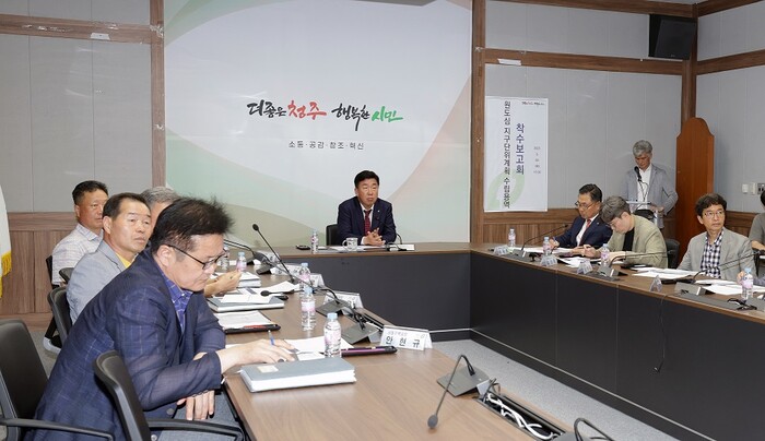 이날 보고회에는 이범석 청주시장과 외부 전문가, 관계 공무원 등 10여 명이 참석해 용역 수행기관(동명기술공단)의 과업 실행계획을 듣고, 수립 방향에 대한 의견을 나누는 것으로 진행됐다.