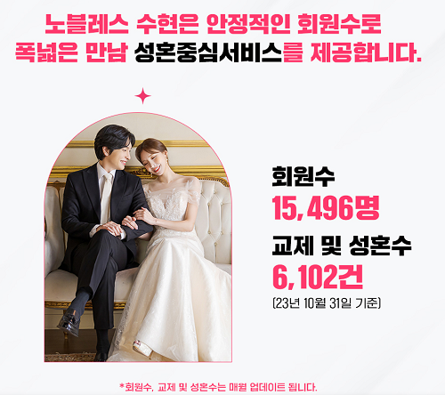 노블레스 수현 관계자는 “노블레스 수현은 소비자의 알 권리를 중시하는 결혼정보 업체로서 매월 전체 회원 수와 교제·성혼 건수를 집계한 뒤 홈페이지에서 투명하게 공개하고 있다”고 설명했다.