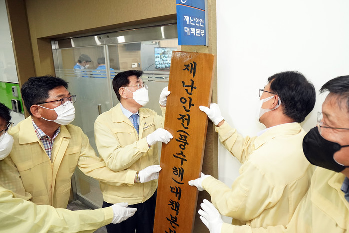 서울 동대문구는 지난 16일 풍수해 재난안전대책본부 개소식을 개최했다. 구는 오는 10월15일까지 여름철 종합대책 기간으로 정하고 풍수해 대책, 폭염 대책 등 5개 분야 22개 단위사업을 추진한다. 사진은 개소식에서 유덕열 구청장(가운데 왼쪽)과 관계자들이 현판식을 하고 있는 모습. (사진제공=동대문구청)