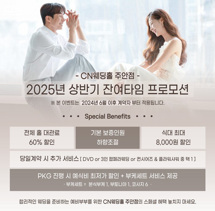 24년 6월 이후 계약자부터 적용되는 이번 25년 상반기 잔여 타임 프로모션은 전체 홀 대관료 60% 할인, 기본 보증 인원 하향조절, 식대 최대 8천원 할인 뿐만 아니라 당일 계약 시 DVD or 3인 팝페라 웨딩 or 컨시어지 + 플라워샤워 중 한 가지를 택할 수 있다고 한다.