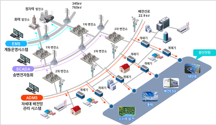 이번에 구축·운영 중인 ADMS는 첨단 ICT 기술을 융합한 차세대 시스템으로 기존의 배전망 운영시스템인 배전자동화 시스템을 대체하여 배전계통을 실시간 운영하고 재생E를 효율적으로 관리, 운영하는 업무에 활용된다.