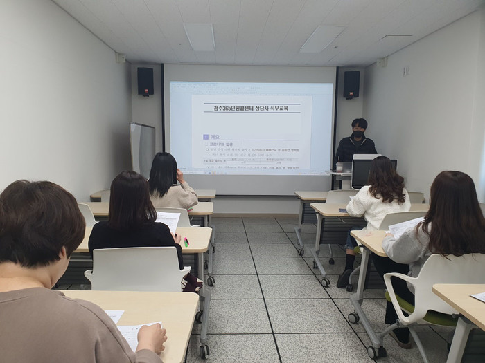 청주시가 지난 14일 청원구청 6층(청주민원콜센터 내 교육장)에서 청주365민원콜센터 상담사 25명을 대상으로 임시청사 이전과 코로나19 재택관리지원 상담센터 관련 직무교육 및 친절교육을 실시했다.
