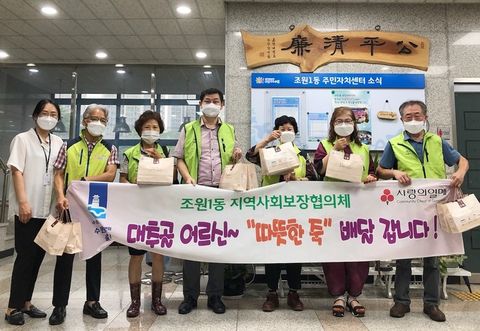 경기 수원시 장안구 조원1동 지역사회보장협의체는 지난 9일 치아 부실과 질병 등으로 섭식 장애를 겪고 있는 지역내 취약계층 노인 12명을 대상으로 ‘따뜻한 죽 나눔’ 행사를 진행했다. 사진은 이날 행사 관계자들이 기념촬영을 하고 있는 모습. (사진제공=장안구청)