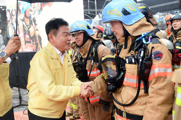 | ▲ 이필형 동대문구청장(왼쪽 두 번째)가 ‘초고층 건축물 화재대응 현장훈련’을 마친 소방대원을 격려하고 있다.(사진=동대문구청 제공) |
