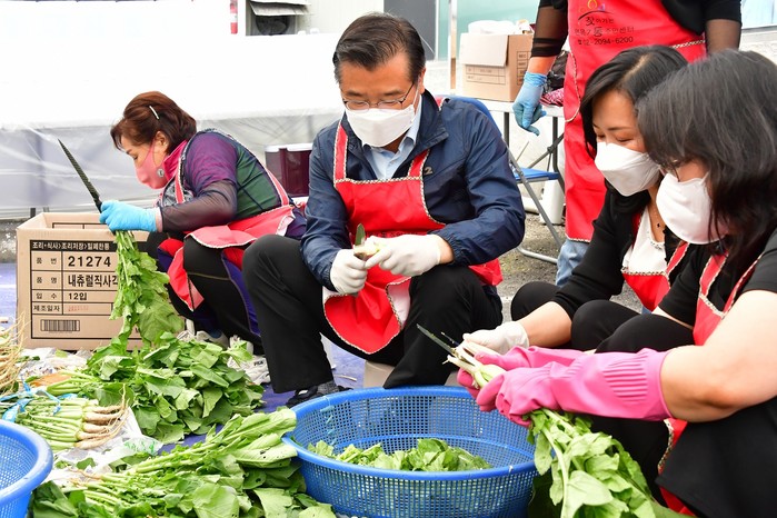서울 중랑구는 지난 8일 저소득 취약계층의 시원한 여름 나기를 위한 사랑의 물김치 나눔 행사를 진행해 열무김치 500kg을 담가 지역내 취약계층 70여가구와 경로당 11곳에 전달했다. 사진은 이날 류경기 구청장(왼쪽 두번째)이 봉사자들과 재료를 다듬고 있는 모습.(사진제공=중랑구청)