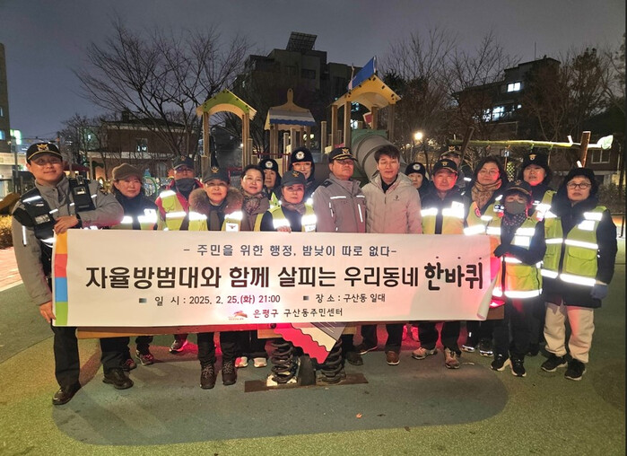 [시민일보 = 이대우 기자] 은평구(구청장 김미경) 구산동은 지난달 25일 자율방범대와 함께 야간 합동 순찰을 진행했다고 밝혔다.