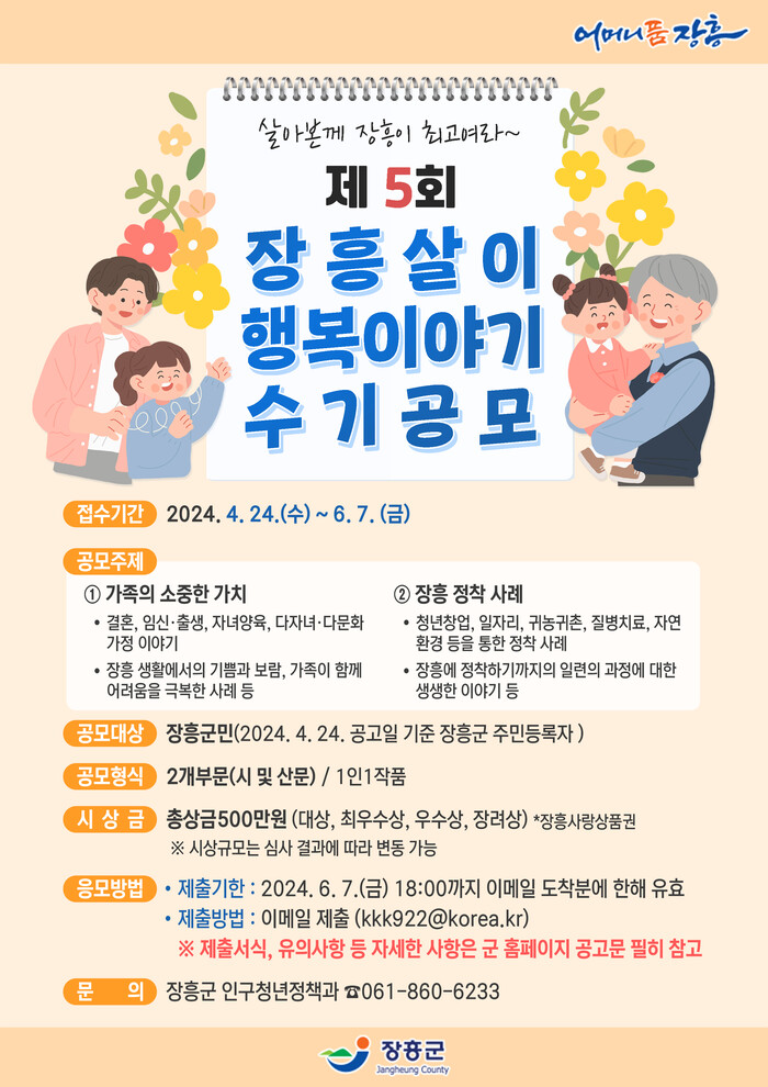 주제는 장흥에 살면서 느낀 진솔한 이야기, 결혼, 자녀양육 등 가족의 소중한 가치, 귀농ㆍ귀촌, 질병치료, 자연환경 등 장흥에 안착하기까지의 사례들이다.