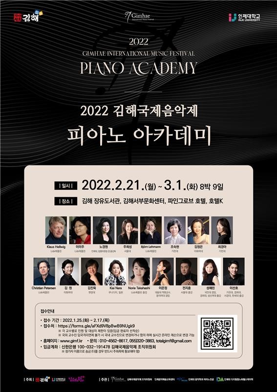 피아노 아카데미는 사전접수를 통해 초중고교생 25명이 참가하여 2월 21일부터 3월 1일까지 9일간 장유도서관, 김해서부문화센터 및 파인그로브 관광호텔, 호텔k에서 진행된다.