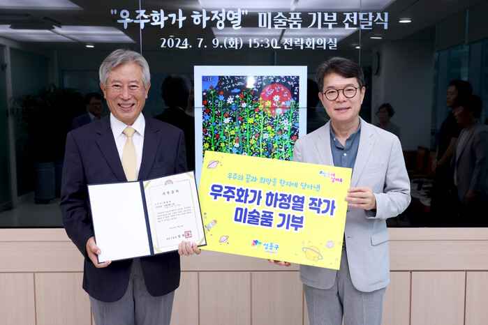 [시민일보 = 이대우 기자] 서울 성동구(구청장 정원오)는 우주를 주제로 독창적인 작품 세계를 펼쳐온 '우주화가' 하정열 작가에게 미술품을 기부받았다.