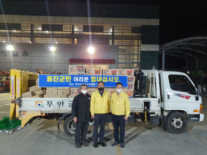 무안군에 따르면 7일 오후 무안군청에서 컵라면과 생수, 수건, 양파음료 등을 실은 차량이 7시간을 달려 울진군 이재민 대피소에 도착해 실의에 빠진 주민들에게 위로와 희망을 줬다.