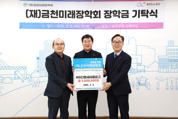 서울 금천구가 지난 5일 (재)금천미래장학회에서 MG다원새마을금고와 남헌모씨의 장학금 기탁식을 열었다. MG다원새마을금고는 지난해 2월에 이어 2025년에도 500만원을 기탁하며 지역 인재 육성을 위한 지원을 이어갔다. 사진은 기탁식에서 이충원 MG다원새마을금고 이사장(가운데)과 박준식 금천미래장학회 이사장(왼쪽), 유성훈 구청장(오른쪽)이 기념촬영을 하고 있는 모습. (사진=금천구청 제공)
