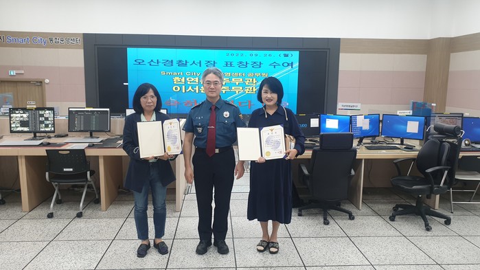 경기 오산시 스마트시티통합운영센터 CCTV 관제요원들이 면밀한 모니터링으로 음주운전 피의자를 검거한 공로로 최근 오산경찰서로부터 표창장을 수여받았다. 사진은 이날 표창장 수여식에서 관계자들이 기념촬영을 하는 모습. (사진제공=오산시청)