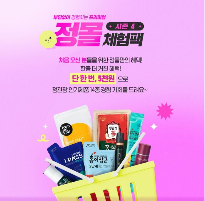 또한 KGC인삼공사는 정몰 신규가입 회원을 대상으로 ‘정몰 체험팩 시즌4’도 진행한다. 정관장 키즈·청소년 브랜드인 ‘홍이장군’, ‘아이패스’를 비롯하여 ‘홍삼톤’, ‘기:다림 침향’, ‘에브리타임 필름’ 등 정관장 대표 제품 14종의 체험팩을 5천원에 구매할 수 있는 혜택을 마련했다.