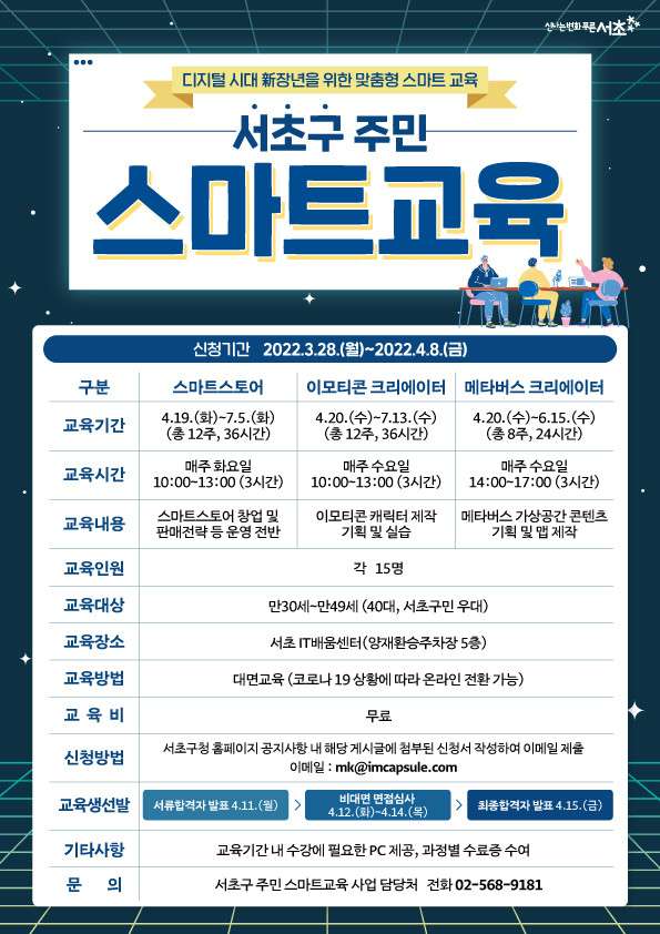 ‘서초 주민 스마트교육’은 청년과 어르신에 비해 상대적으로 디지털·스마트 관련 교육기회가 적었던 중장년층을 주 대상으로 한 디지털 역량강화 교육이라는 점에서 눈길을 끈다. 이번 교육은 △스마트스토어 △메타버스 크리에이터 △이모티콘 크리에이터 총 3가지로 오는 4월 19일부터 개별 운영된다.