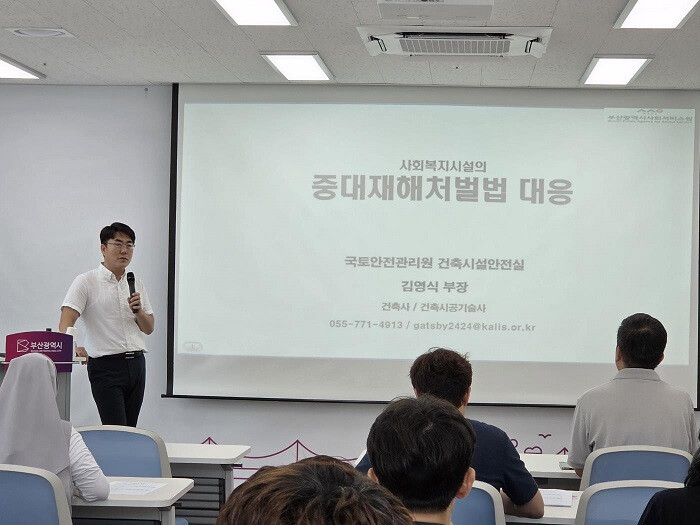 워크숍에서는 국토안전관리원 김영식 부장(건축사)이 강사로 나서 사회복지시설의 특성을 고려한 맞춤형 교육을 진행했다.