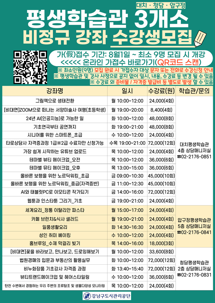 한편, 이번 하반기 강좌 공모에서 선발된 24개 강좌는 8월 1일부터 평생학습관 3개소에서 가접수를 통해 회원을 모집 후 개강할 예정이다.