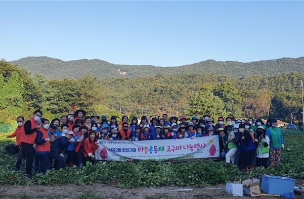 경기 의정부시 신곡2동이 최근 마을공동체 도시텃밭에서 ‘신곡2동 맛있구마 마을공동체 나눔행사’를 실시해 약 600평의 농지에 식재한 고구마를 수확했다. 사진은 이날 참여한 봉사자들이 기념촬영을 하고 있는 모습. (사진제공=의정부시청)
