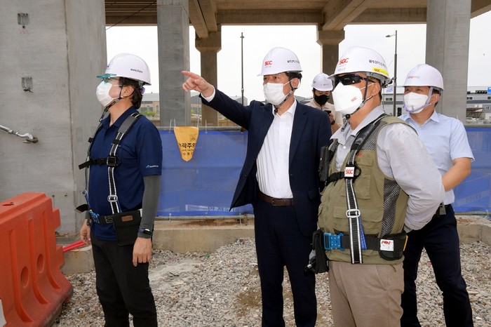 [광주=정찬남 기자] 조인철 광주광역시 문화경제부시장이 9일 오후 광산구 평동3차 산단 내 투자기업인 쿠팡(주) 물류센터 공사현장을 방문해 관계자로부터 투자 진행상황과 애로사항을 청취하고 있다. /광주광역시 제공