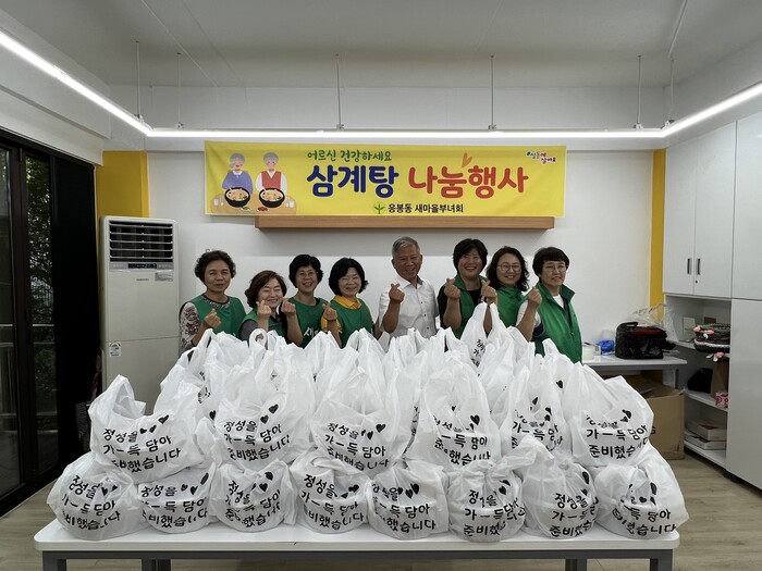 응봉동 새마을부녀회는 신선한 재료를 위해 하루 전날 장을 보고 삼계탕 70인분을 정성껏 만들어 찰밥, 김치와 함께 어르신들에게 따뜻한 마음을 전달하였다. 응봉동 새마을부녀회는 그간 매해 여름, 겨울철이나 명절에 소외될 수 있는 저소득층이나 경로당 어르신들을 위하여 음식을 나누었다.