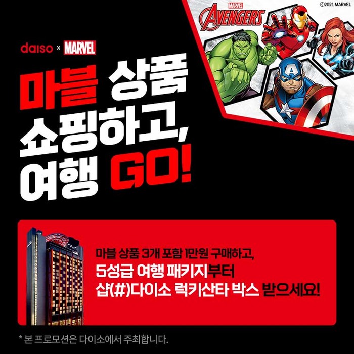 매주 ‘마블 시리즈 상품’ 최대 구매자에게 '페어몬트 앰배서더 서울' 여행 패키지, 추첨을 통해 '인터컨티넨탈 서울 코엑스' 여행 패키지와 '샵다이소 럭키 산타박스'를 증정한다. 자세한 사항은 샵다이소 앱에서 확인할 수 있다.