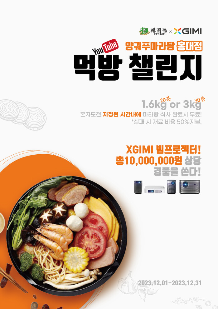 양궈푸마라탕 관계자는 “마라 매니아들에게 색다른 즐거움을 드리기 위해 ‘먹방챌린지’를 준비했다. 뜨거운 열정으로 도전에 응해주신 고객 여러분에게 진심으로 감사드리며 챌린지가 종료되는 올해 말까지 더 많은 성공 기록이 등장하기를 소망하겠다. 양궈푸마라탕 홍대점에서 화끈한 ‘먹방챌린지’에 도전하시기 바란다”고 말했다.