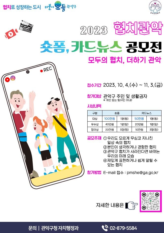 [시민일보 = 여영준 기자] 서울 관악구(구청장 박준희)는 오는 10월 4일부터 11월 3일까지 '2023 협치관악 숏폼, 카드뉴스 공모전'을 개최한다고 밝혔다.