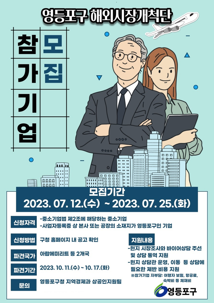 [시민일보 = 여영준 기자] 서울 영등포구(구청장 최호권)는 지역내 중소기업을 대상으로 해외시장 판로개척과 수출 경쟁력 강화를 위해 오는 25일까지 '2023 영등포구 해외시장개척단' 참가 기업 10개사를 모집한다고 밝혔다.
