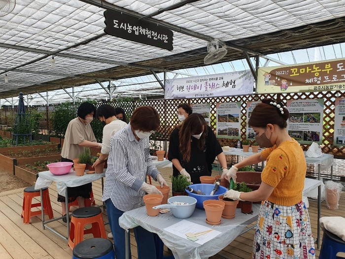 경기 광주시가 ‘시민과 함께하는 반려 식물 허브 교육’을 오는 10월까지 체험과정(4기 32회 256명)과 심화과정(10기 30회 100명)으로 나눠 운영하고 있다. 6월 체험과정으로는 허브 화분 만들기와 재배 관리 및 활용 방법, 허브전시관 관람 등이 예정되어 있다. 사진은 최근 허브 화분 만들기가 진행되고 있는 모습.(사진제공=광주시청)
