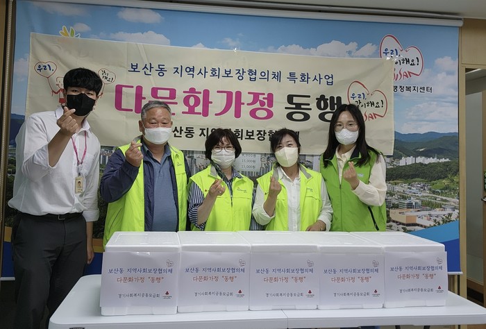 경기 동두천시 보산동 지역사회보장협의체는 지난 9일 생활이 어려운 다문화가정 5가구를 방문해 안부를 확인하고 식품 박스(볶음밥, 소시지, 치킨 등)를 전달했다. 사진은 관계자들이 기념촬영을 하는 모습.(사진제공=동두천시청)