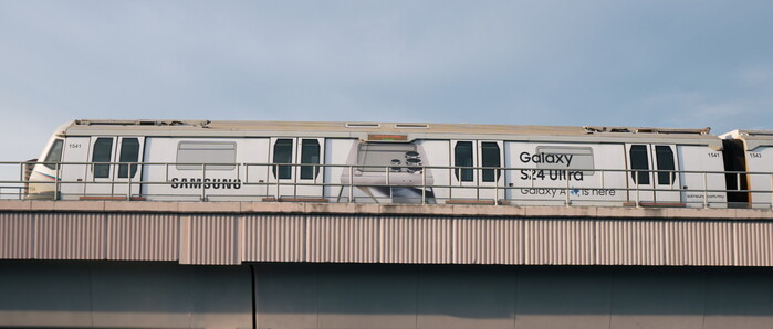 | ▲ '갤럭시 S24'와 '갤럭시 AI' 이미지로 랩핑된 말레이시아 쿠알라룸푸르 지하철 내·외부.(사진=삼성전자 제공) |