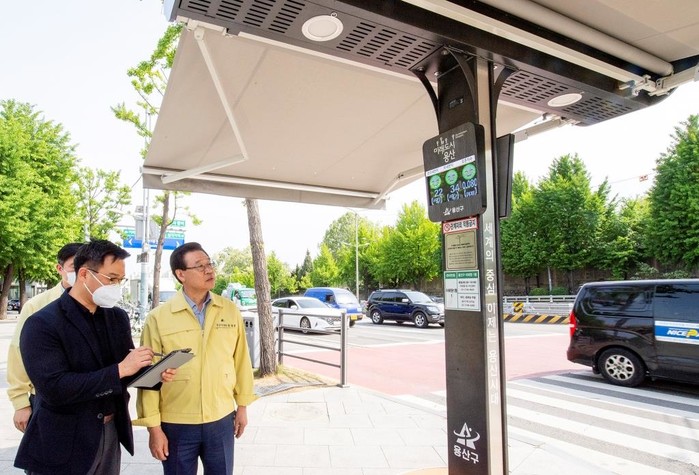 성장현 서울 용산구청장이 2022년 폭염대책 추진기간 전 폭염 예방 시설물 운영 현황을 점검하기 위해 11일 서울관광경찰대 이태원센터 앞과 녹사평대로 교통섬 내 ‘스마트 그늘막’ 설치 현장을 찾아 운영실태와 정상 작동 여부를 살폈다. 사진은 성 구청장(오른쪽)이 관계자에게 스마트 그늘막 작동에 대해 설명을 듣고 있는 모습. (사진제공=용산구청)