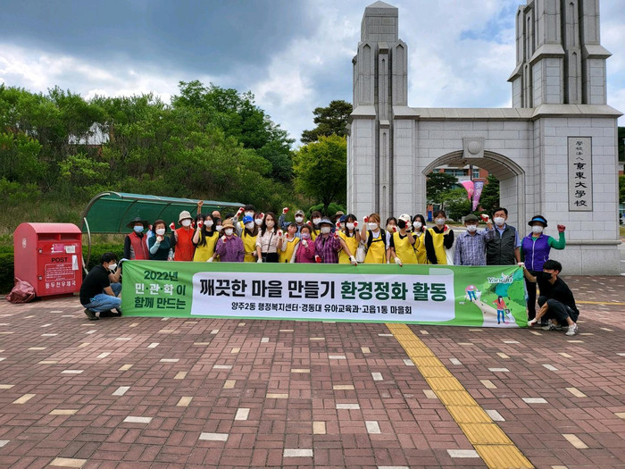 경기 양주시 양주2동 행정복지센터는 최근 고읍1통 지역주민, 경동대학교 유아교육과 학생 등 30여명과 함께 학교 주변과 마을 안길 등 청소 취약지역에 가로환경정비를 실시했다. 사진은 참여자들이 기념촬영을 하는 모습. (사진제공=양주시청)