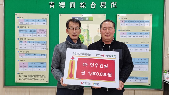 윤진우 대표는 “추운 겨울 어려움을 겪고 있는 청덕면 주민에게 따뜻함이 전달되기를 희망하며 앞으로도 지역사회에 조금이라도 도움이 될 수 있도록 나눔 활동에 앞장서겠다”고 밝혔다.