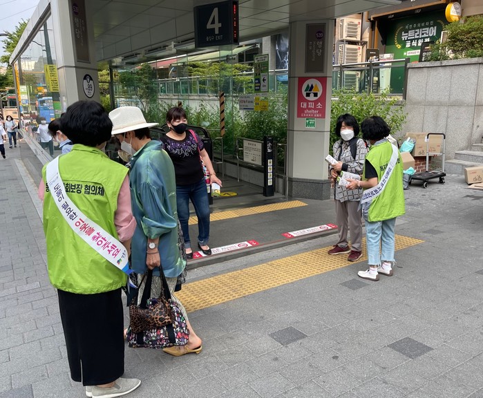 서울 성동구 행당제2동 지역사회보장협의체는 지난 8일 행당역 일대 및 상점가에서 ‘어려운 이웃을 찾아주세요, 알려주세요, 함께 도와요’라는 메시지와 함께 복지사각지대 발굴을 위한 민·관협력 복지사각지대 발굴 공동캠페인을 실시했다. 사진은 캠페인에서 주민들을 대상으로 복지사각지대 발굴 홍보물품을 배부하고 있는 모습.(사진제공=성동구청)