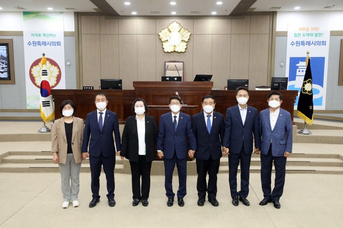 | ▲ (왼쪽부터) 조미옥 도시환경위원장, 조문경 문화체육교육위원장, 유준숙 기획경제위원장, 김기정 의장, 이재식 부의장, 강영우 의회운영위원장, 정영모 복지안전위원장이 기념촬영을 하고 있다. (사진제공=수원시의회) |