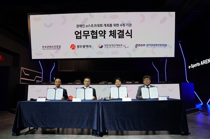 [광주=정찬남 기자] 광주광역시(시장 강기정)는 한국콘텐츠진흥원(원장 조현래), 대한장애인체육회(회장 정진완), 광주정보문화산업진흥원(원장 이경주)과 함께 ‘장애인 이스포츠 대회’ 개최를 위한 업무협약을 5월 31일 광주 이스포츠경기장에서 체결했다.