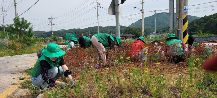 경기 이천시 마장면 새마을남녀지도자협의회는 최근 이틀에 걸쳐 해월리에서 이평리에 이르는 하천변과 오천리 등에서 예초 작업 및 화단잡초 제거를 실시했다. 사진은 새마을 회원들이 예초 작업 및 화단잡초 제거를 하고 있는 모습.(사진제공=이천시청)